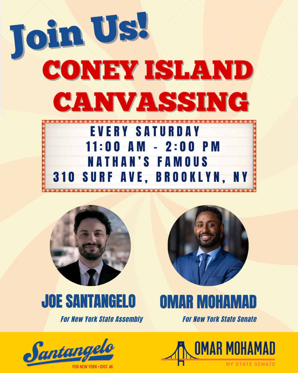 Come join us at Nathan’s Famous in Coney Island to canvass for two incredible candidates. No prior experience necessary.